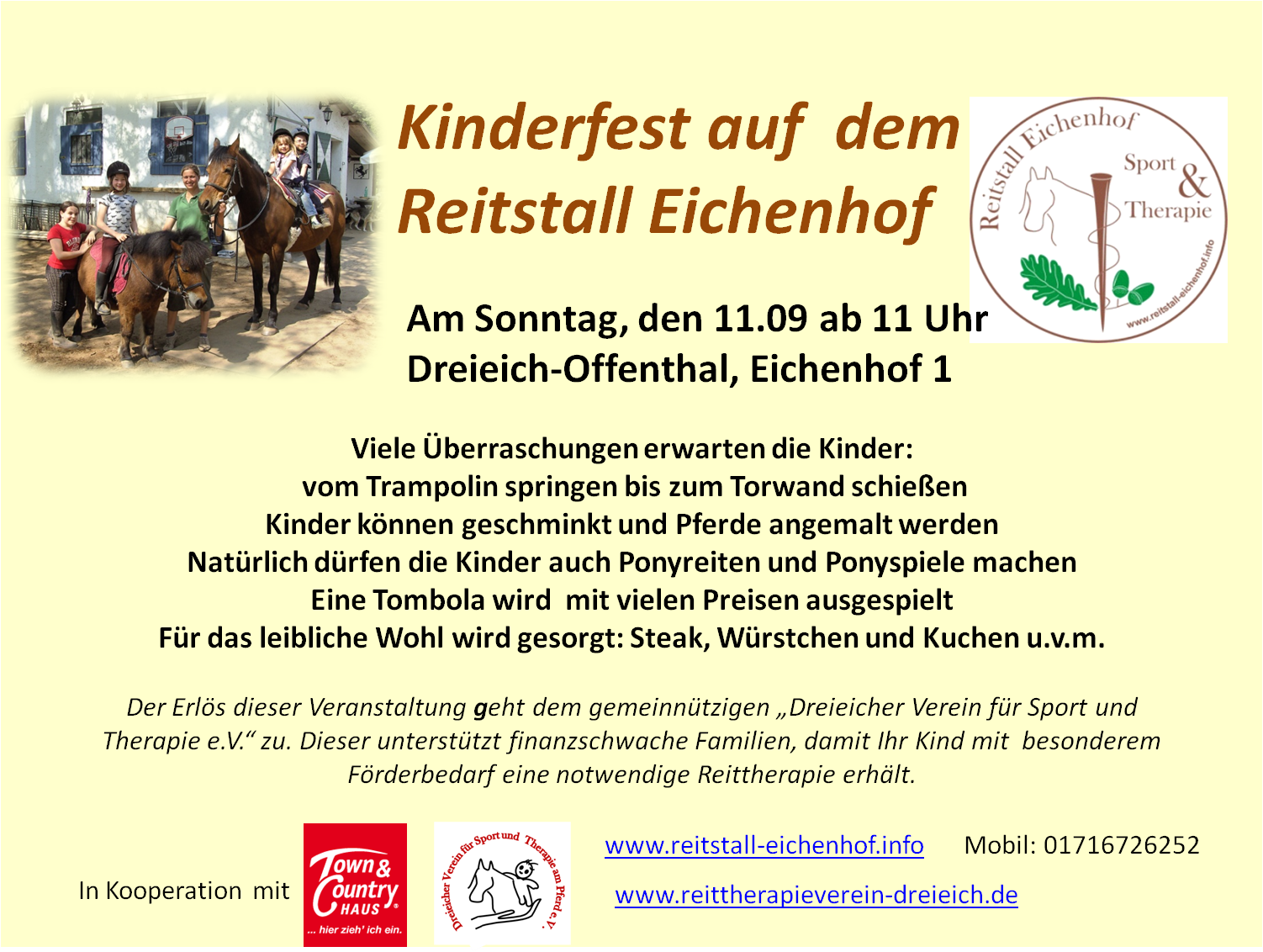 Ein voller Erfolg wurde unser Kinderfest am 2.9.2016. Über 100 Interessierte besuchten das Fest und feierten mit uns bis in den späten Nachmittag. Die Tombola hatte für jeden Teilnehmer einen Gewinn Dank vieler Spender. Allen Voran bedanken wir uns bei den Mitbestreitern der Veranstaltung, der Firma Sierra Massivhaus aus Sprendlingen, ein Partner von Town und Country, haben viel zum Gelingen des Nachmittags beigetragen. Der Gewinn geht vollständig an das Projekt "Lichtblicke und Atempausen" des "Dreieicher Vereins für Sport und Therapie am Pferd e.V.". Auf eine baldige Fortsetzung freuen sich alle Beteiligten.
